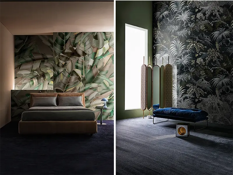 Klimat urban jungle osiągniemy nie tylko za pomocą żywych roślin. Równie dobrze sprawdzą się te pojawiające się na płytkach, tkaninach i tapetach. W wersji dla odważnych występują w żywych, soczystych odcieniach zieleni i najczęściej w wersji tropikalnej. Mile widziane są liście monstery, bananowca czy nawet palmy.