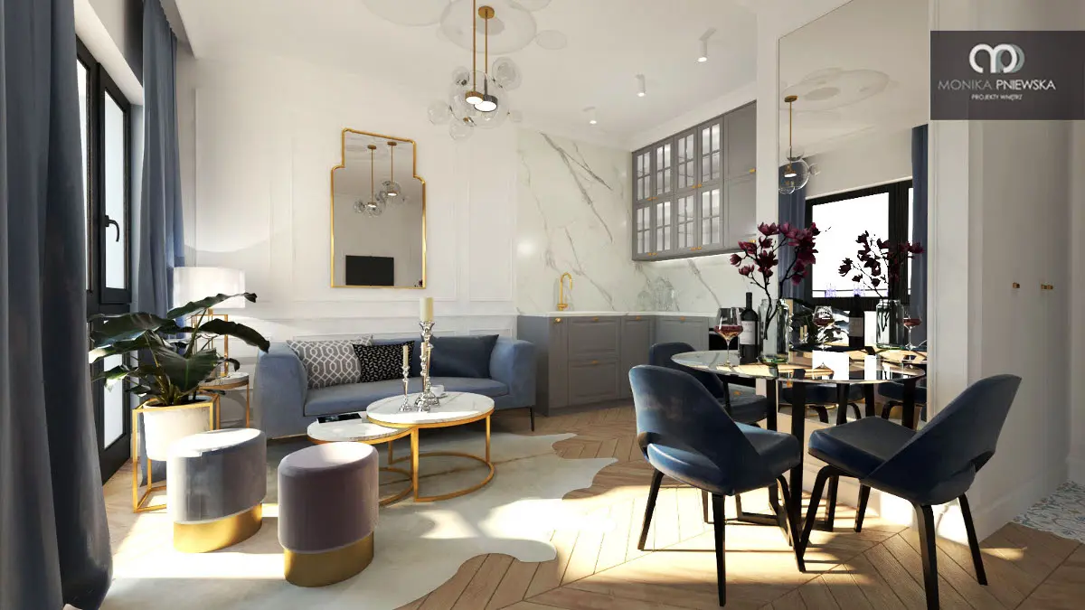 Zestaw wypoczynkowy, niebieska sofa w połyskującym modnym aksamicie zyskał doborowe towarzystwo marmurowych stolików na złotych nóżkach i welurowych krzeseł oraz przepięknych i najmodniejszych w tym seozonie puf. Całość zamyka miękki biały dywan i przepiękna, oryginalna lampa wisząca. Et voilà!