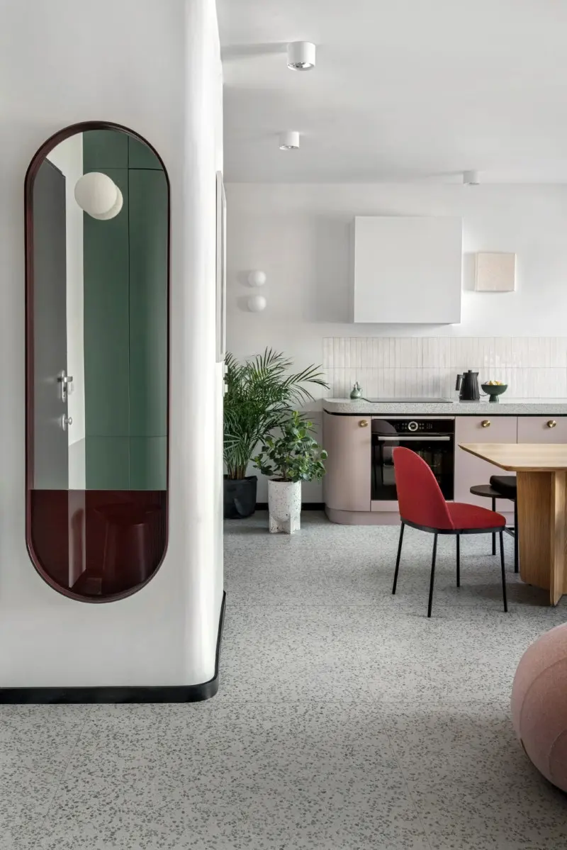 Lastryko jest barwne i wyraziste, toteż najlepiej komponuje się z gładkimi materiałami. Jednak nic nie stoi na przeszkodzie, aby połączyć terrazzo z lakierowanymi meblami. Kontrastowe połączenie matowych płytek z połyskującymi powierzchniami sprawia, że wnętrze emanuje harmonią i dobrą energią.