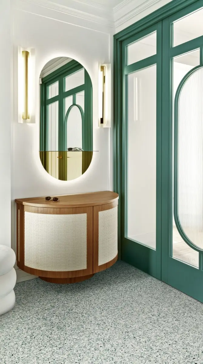 W zależności od tego, jaki chcemy otrzymać efekt, czy bardziej wyrazisty, czy stonowany, wybierzemy mniej lub bardziej nasycony kolor przewodni. W przypadku kolorowego lastryko najlepiej wyodrębnić jeden z kolorów występujących na płytce i uznać jako barwę drugorzędną (jak w przypadku poniższej aranżacji – butelkowa zieleń) lub wprowadzić obrany ton jedynie w formie detali. Ważne, aby wszystkie kolory stanowiły spójną kompozycję.