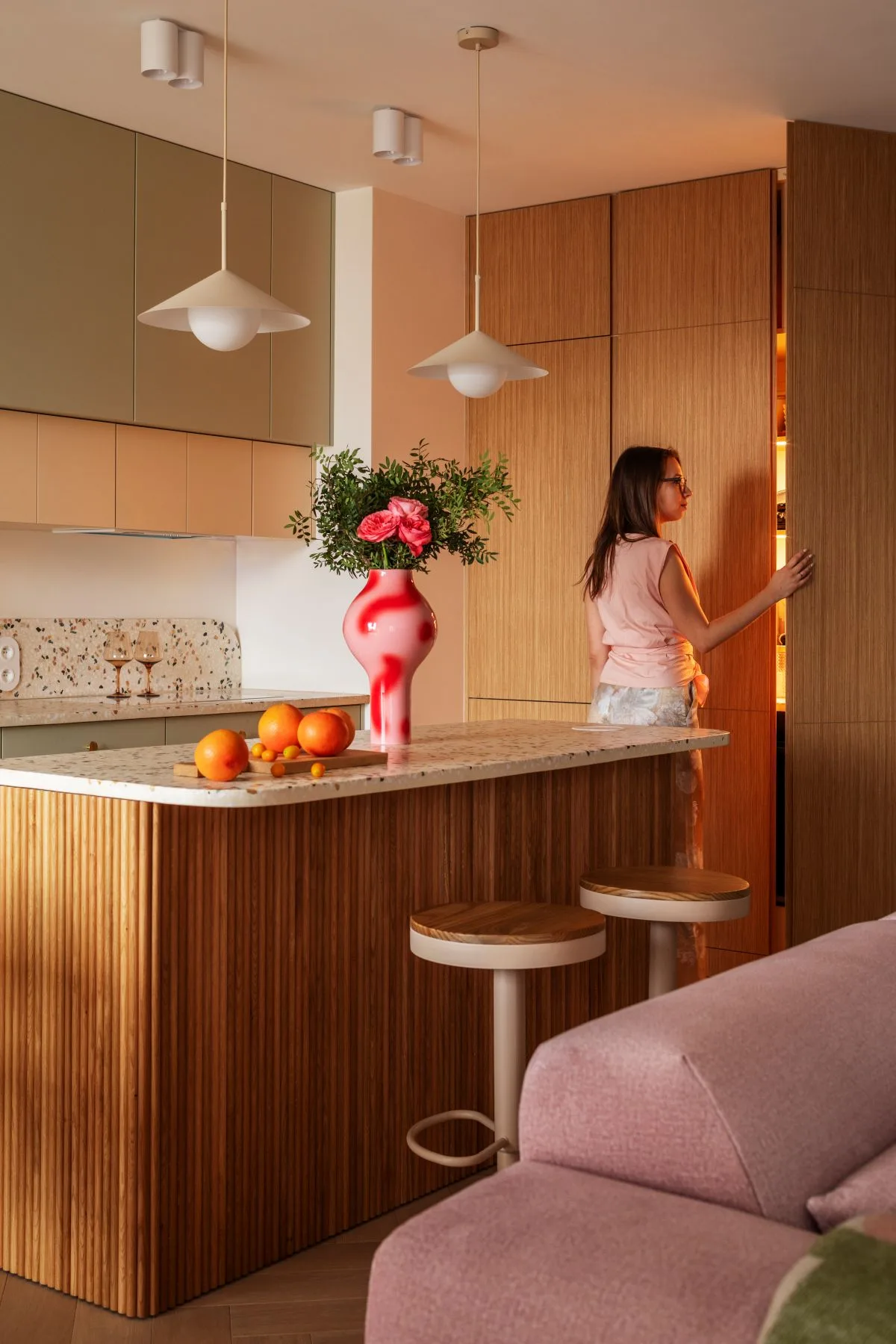 Nie ma co ukrywać – lastryko (nawet w stonowanym wydaniu) jest dość wyrazistym materiałem. Dlatego decydując się nań, należy dobrze przeanalizować dobór pozostałych elementów wyposażenia, aby nie przesadzić. Zazwyczaj terrazzo stanowi dominantę i najmocniejszy punkt w aranżacji. Nie oznacza to jednak, że reszta ma być nudna.