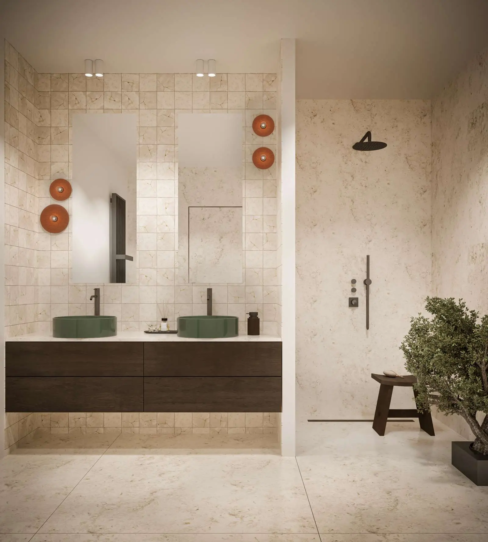 Hiszpański producent płytek WOW Design też przechwycił tę sztukę i stworzył kolekcję ENSO KINTSUGI składających się z małych beżowych, turkusowych, zielonych i czarnych płytek ze złotą żyłką. Znakomitym uzupełnieniem realizacji z tymi płytkami jest kolorowa ceramika Hushlab.