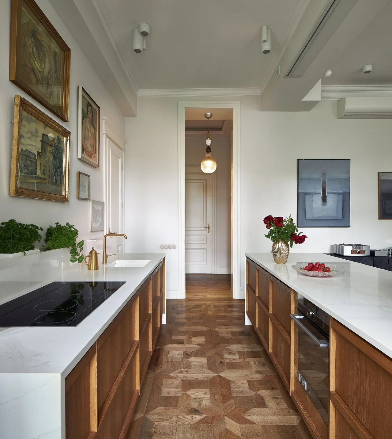 Ciekawa, estetyczna i uporządkowana kuchnia w kształcie litery U jest bardzo uniwersalnym przykładem, który możemy przenieść na swoje domy, bo jest to niezwykle popularny układ. Kolorystyka jest stonowana, zawiera jedynie biel, szarości i gdzie nigdzie zaskakuje nas delikatnymi akcentami srebra. Jest solidnie i porządnie – widać, iż taka kuchnia będzie wytrzymała na lata oraz bardzo stylowa dla każdego.