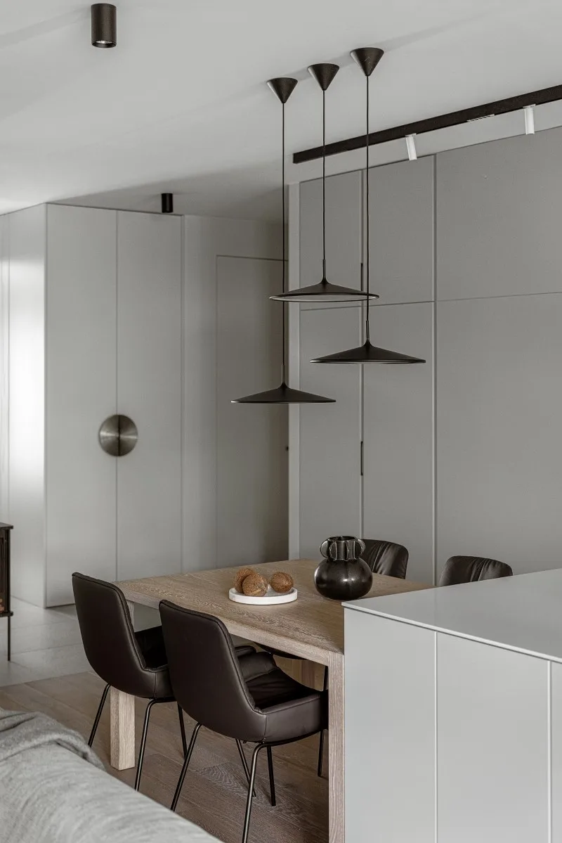 Kontrasty wyglądają świetnie, gdy złamie się je neutralną barwą. Tak jest właśnie w tym przypadku – połączenie czerni i bieli z delikatnym drewnem optycznie łączy wnętrze. Panuje ściśle określony ład, którego projektant się trzymał i dlatego nie odczuwamy wrażenia chaosu.