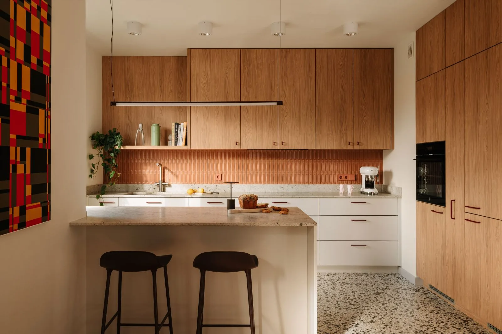 Miejsce pierwsze naszego zestawienia okupuje aranżacja bardzo prosta, piękna oraz stylowa. Jest nowoczesna, ale także bardzo przystępna, a jej wykonanie można zmodyfikować pod własne potrzeby. Kuchnia jest otwarta, ale posiada także blat, przy którym usytuowano kilka hokerów. Jest komfortowo, wygodnie i bardzo przyjemnie.