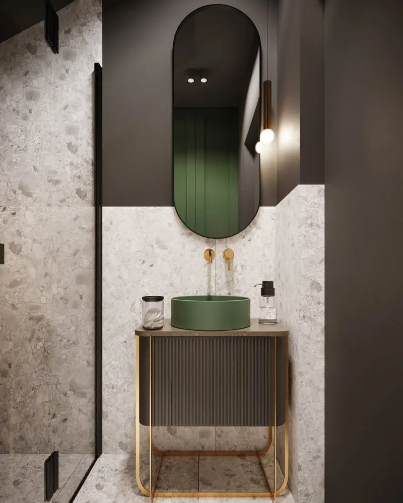 Rozwiązaniem, które cieszy się coraz większym zainteresowaniem w showroomach z Grupy Internity Home i Prodesigne jest kolorowa ceramika łazienkowa polskiej marki HushLab. W poniższym projekcie małej toalety to właśnie zielona umywalka Slim 40 odgrywa pierwszoplanową rolę. Jej oryginalne wykończenie ożywia projekt, w którym dominują szarości. Natomiast złote akcenty sprawiają, że wnętrze staje się bardziej eleganckie.