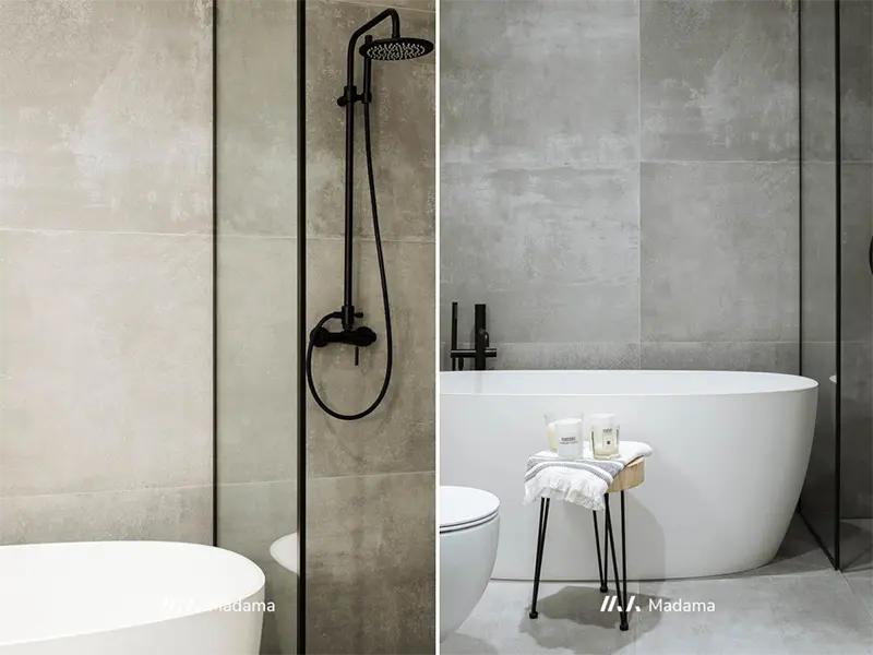 Płytki imitujące beton w łazience zaprojektowanej przez pracownię Madama