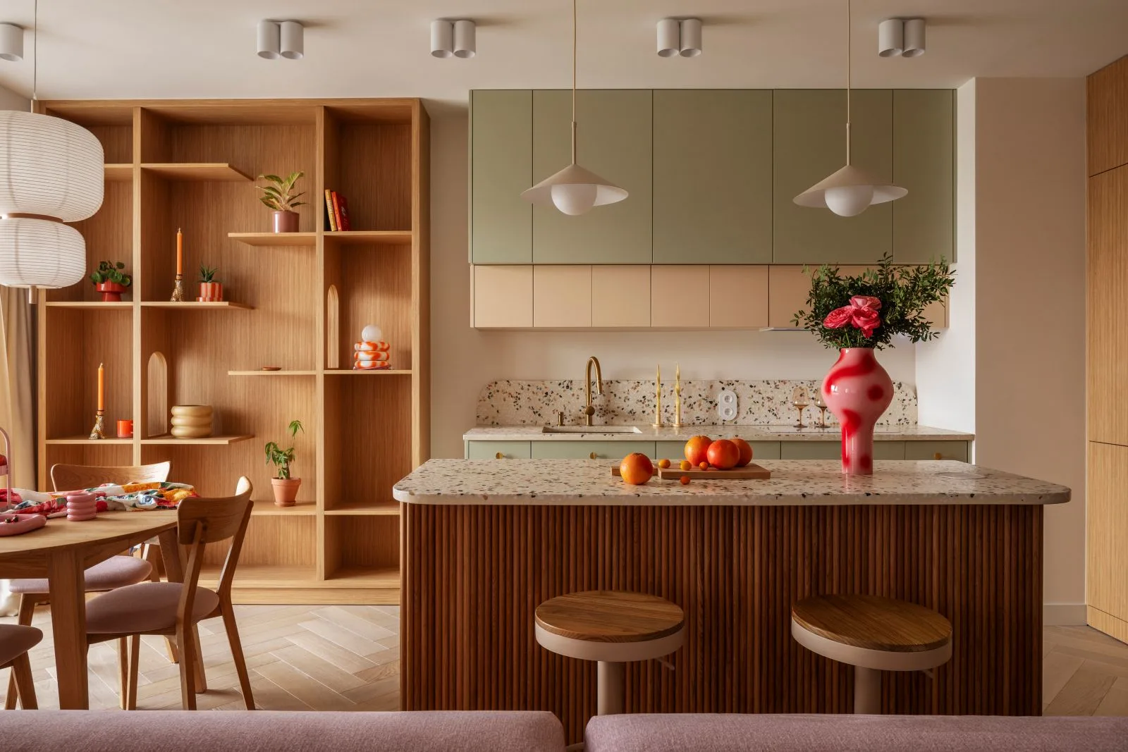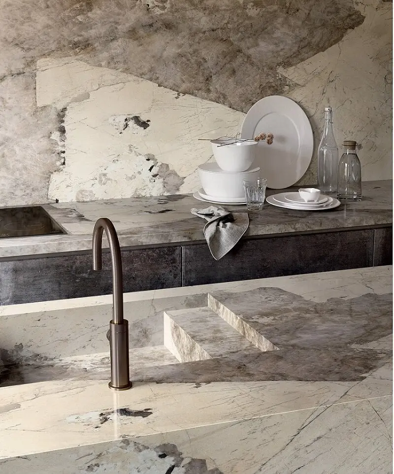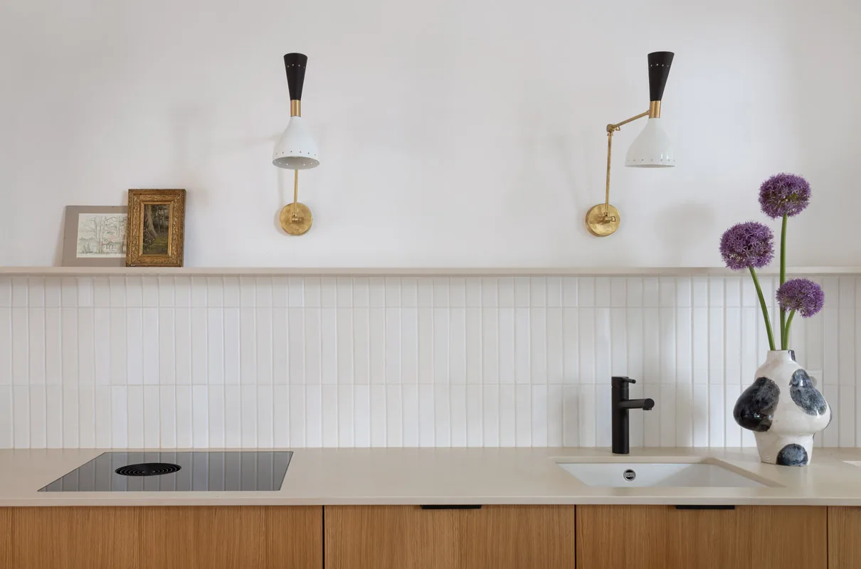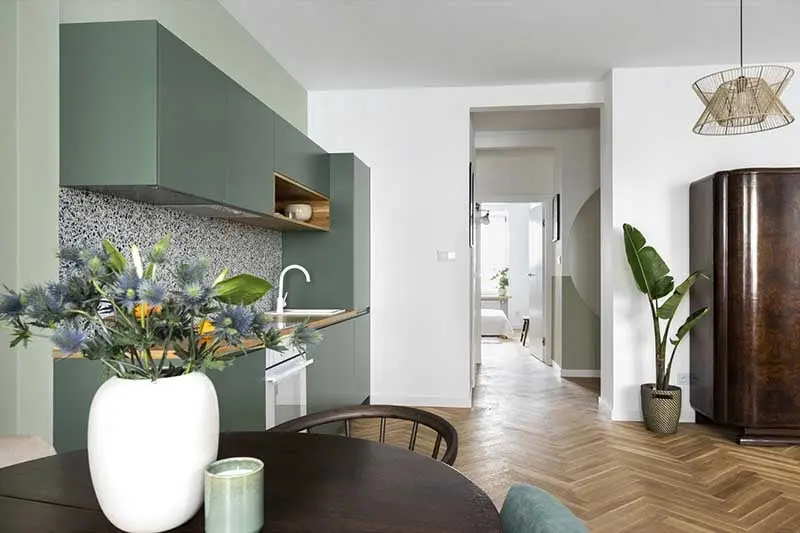 Modny jest więc wzór inspirowany marmurem, z szarymi, czarnymi lub złotymi żyłkami na białym lub szarym tle. Wielkoformatowe płytki coraz częściej pojawiają się na ścianie w kuchni w matowym, jednokolorowym wydaniu, w pięknych paletach barw inspirowanych latami 60-tymi czy 70-tymi, czyli w uwspółcześnionej wersji vintage. Kuchnia vintage to bardzo modny trend w 2021 rok!