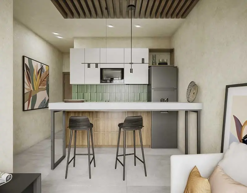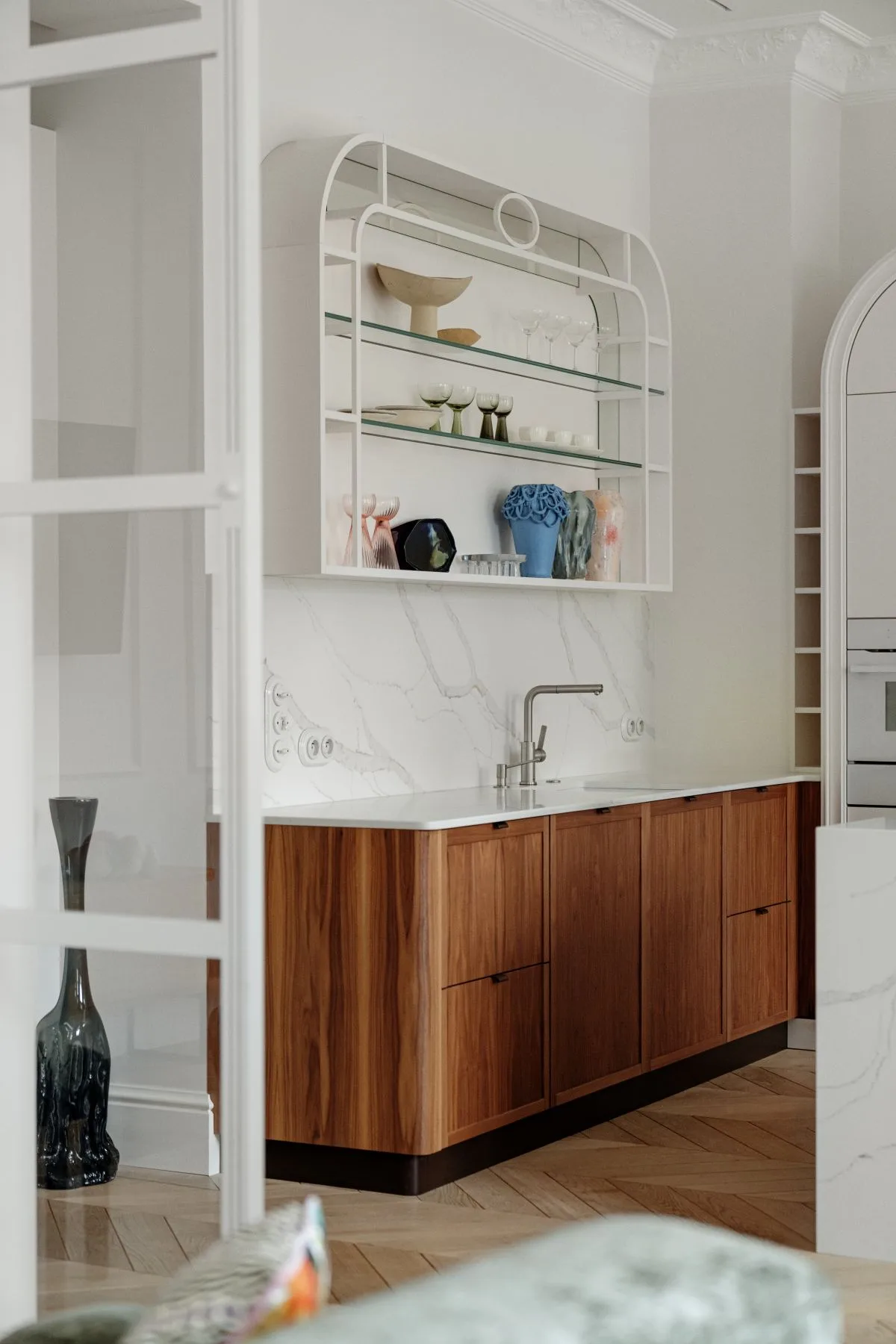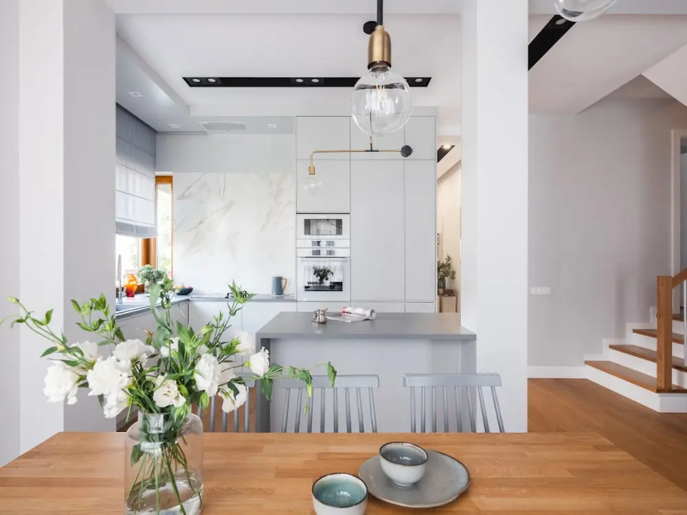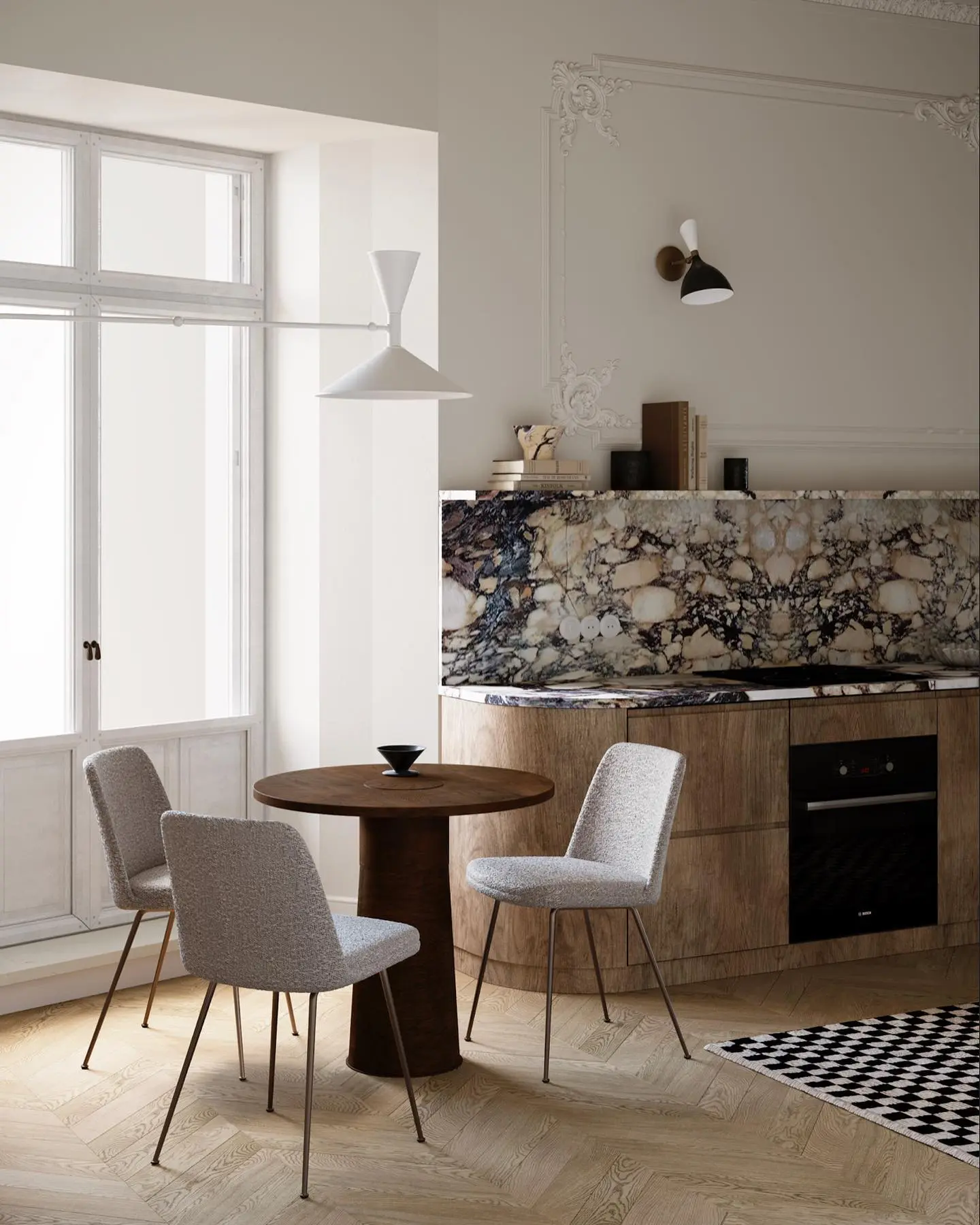 Modny jest więc wzór inspirowany marmurem, z szarymi, czarnymi lub złotymi żyłkami na białym lub szarym tle. Wielkoformatowe płytki coraz częściej pojawiają się na ścianie w kuchni w matowym, jednokolorowym wydaniu, w pięknych paletach barw inspirowanych latami 60-tymi czy 70-tymi, czyli w uwspółcześnionej wersji vintage. Kuchnia vintage to bardzo modny trend w 2021 rok!