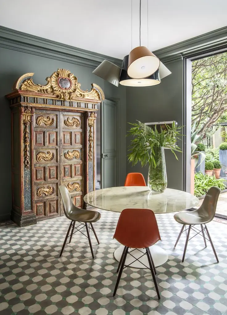 Na poniższym zdjęciu piękna zwieszana lampa Marset, klasyczna posadzka, przepięknie zdobiona szafa i okrągły stół z plastikowymi krzesłami.