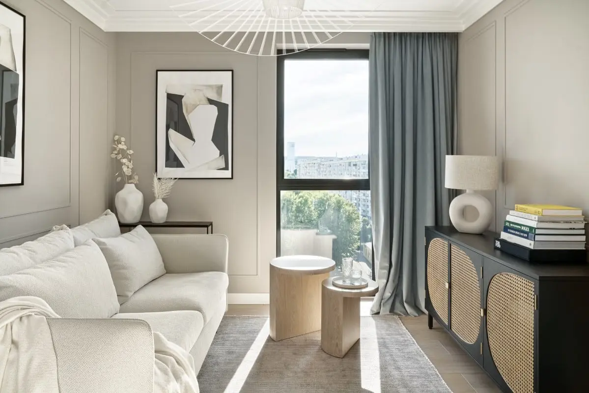 Beż połączony z szarością stanowi prosty przepis na ponadczasowe wnętrze, w którym znajdzie się miejsce na detale w kolorach bardziej przykuwających spojrzenia.