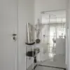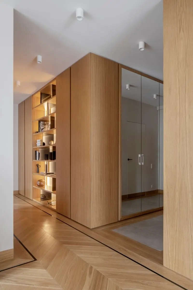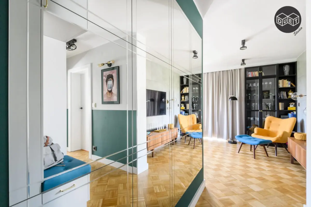 Na koniec klasyk, o którym jednak nie możemy nie wspomnieć. Wysokopołyskowe faktury z lustrzanymi na czele nie dość, że dublują przestrzeń, automatycznie powiększając ją, to jeszcze świetnie odbijają światło, co rozjaśnia wnętrze. Dlatego odpowiedź na pytanie, jak rozjaśnić wąski korytarz, zawsze powinna zawierać wspólny mianownik, jakim są lustra. Ich magiczne działanie często wykorzystują architekci, co z powodzeniem poprawia proporcje mieszkania.
