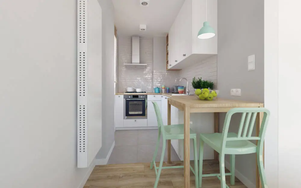 Częstym problemem w małym mieszkaniu jest ulokowanie stołu. W takiej sytuacji najlepiej sprawdza się okrągły blat, a jeśli wolisz prostokątny – idealnym rozwiązaniem jest stół, który jest naturalnym przedłużeniem kuchennego blatu. Alternatywą jest wyspa, która jednak lepiej sprawdza się przy dużym metrażu lub barek, przy którym mogą stanąć stylowe hokery.
