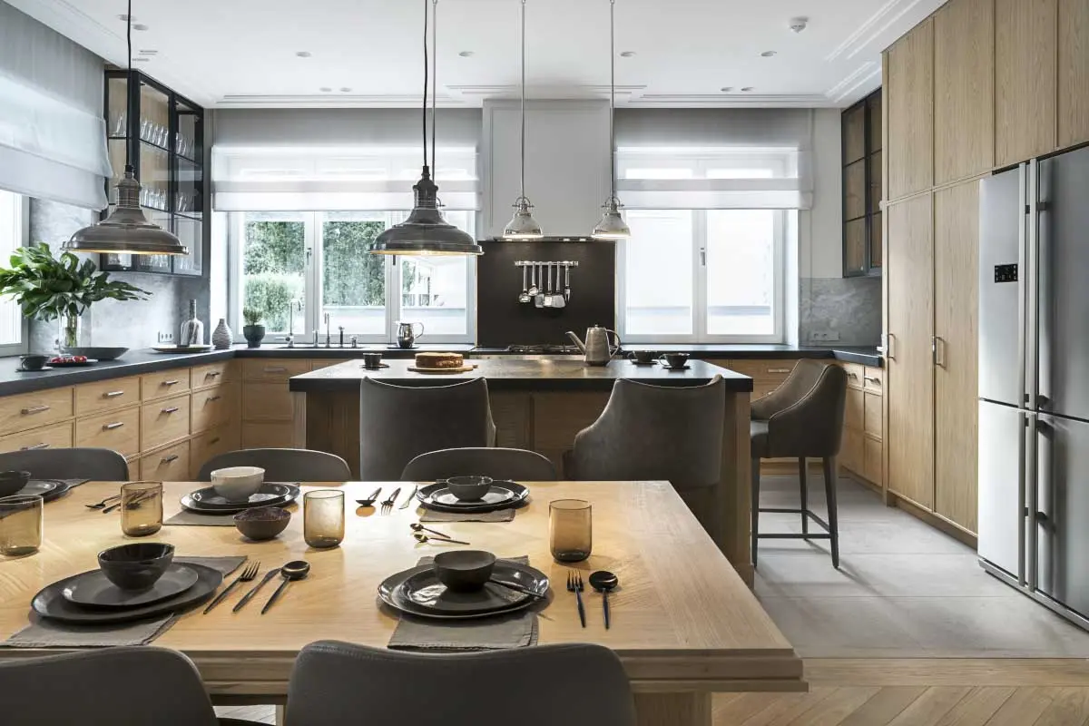 Poniżej umieściłam przykład kuchni, w której dominuje drewno, a której daleko do klasycyzującego wnętrza, nawet pomimo obecności stołu w ludwikowskim stylu. Wszystko za sprawą wykorzystanej szarości, industrialnej tapety i lampy w loftowym klimacie.