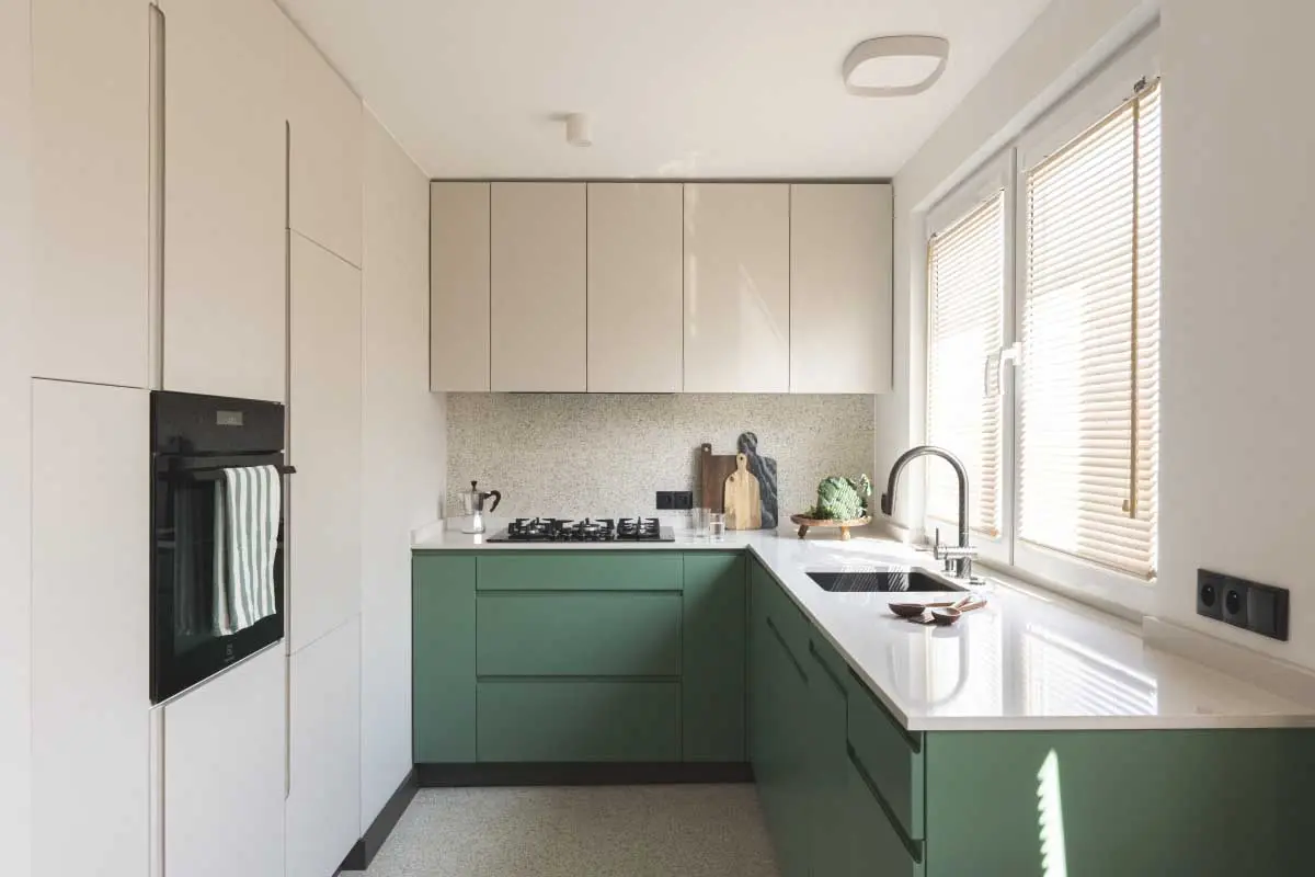 Zabudowa w kuchni ma duże znaczenie w kwestii funkcjonalności. Najczęściej bierzemy pod uwagę rozmiar, kształt, a także ulokowanie okien i drzwi, a następnie dobrać układ mebli. Najbardziej uniwersalnym układem mebli jest kuchnia w kształcie litery „L”. Pozwala ona na wprowadzenie w życie także innych podstawowych zasad ergonomii oraz zapewnia optymalną wygodę poruszania się po wnętrzu.