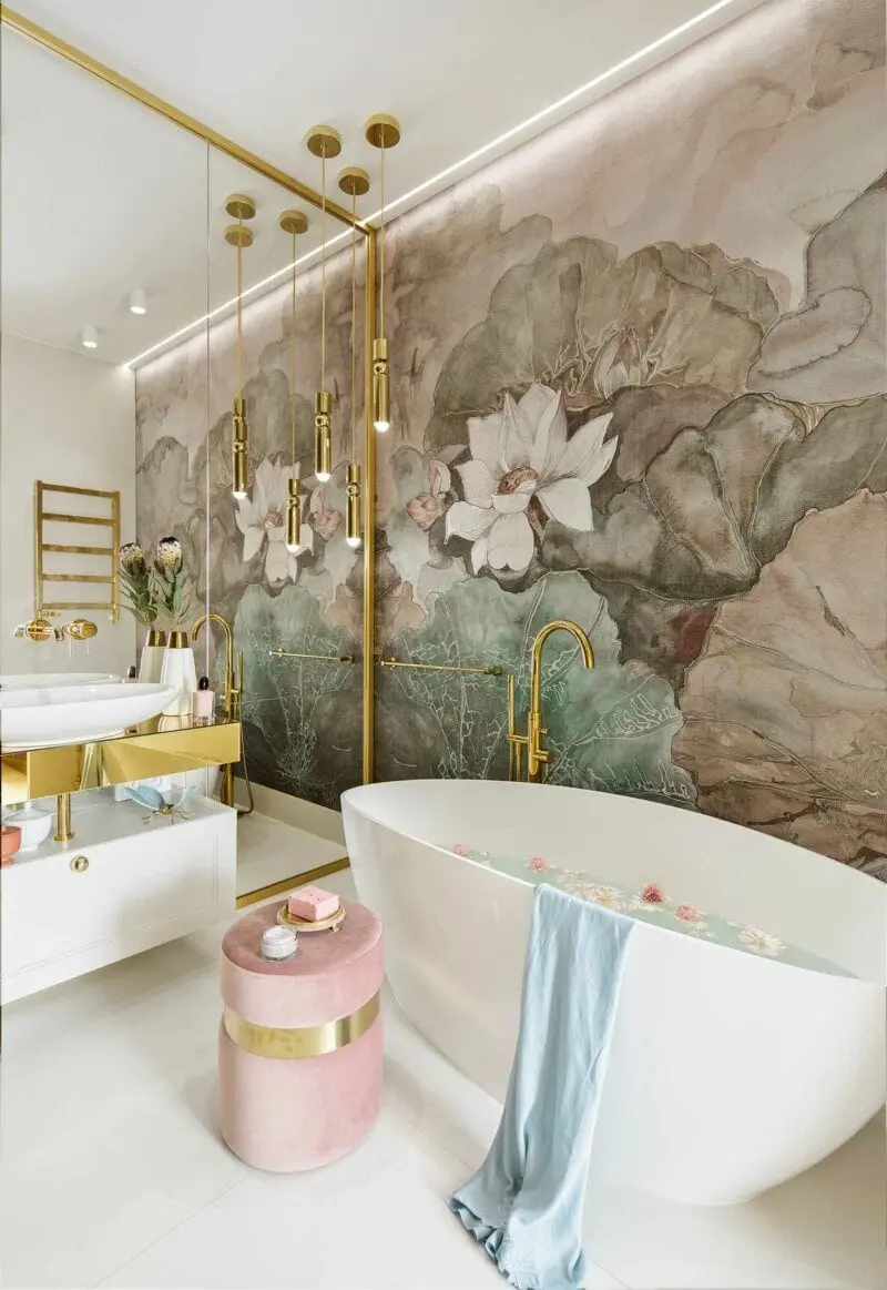 W drugim projekcie tapeta Niveum podkreśla salonowy charakter łazienki. Widać wyraźnie, że w tym wnętrzu na pierwszym miejscu stawia się relaks i odpoczynek po całym dniu pracy. Kwiatowy wzór w sposób doskonały kreuje atmosferę spa we własnych czterech kątach. Duże lustro zamontowane w strefie umywalkowej dubluje ornament i wraz ze złotymi detalami sprawia, że aranżacja ma niezwykle eleganckie zabarwienie.