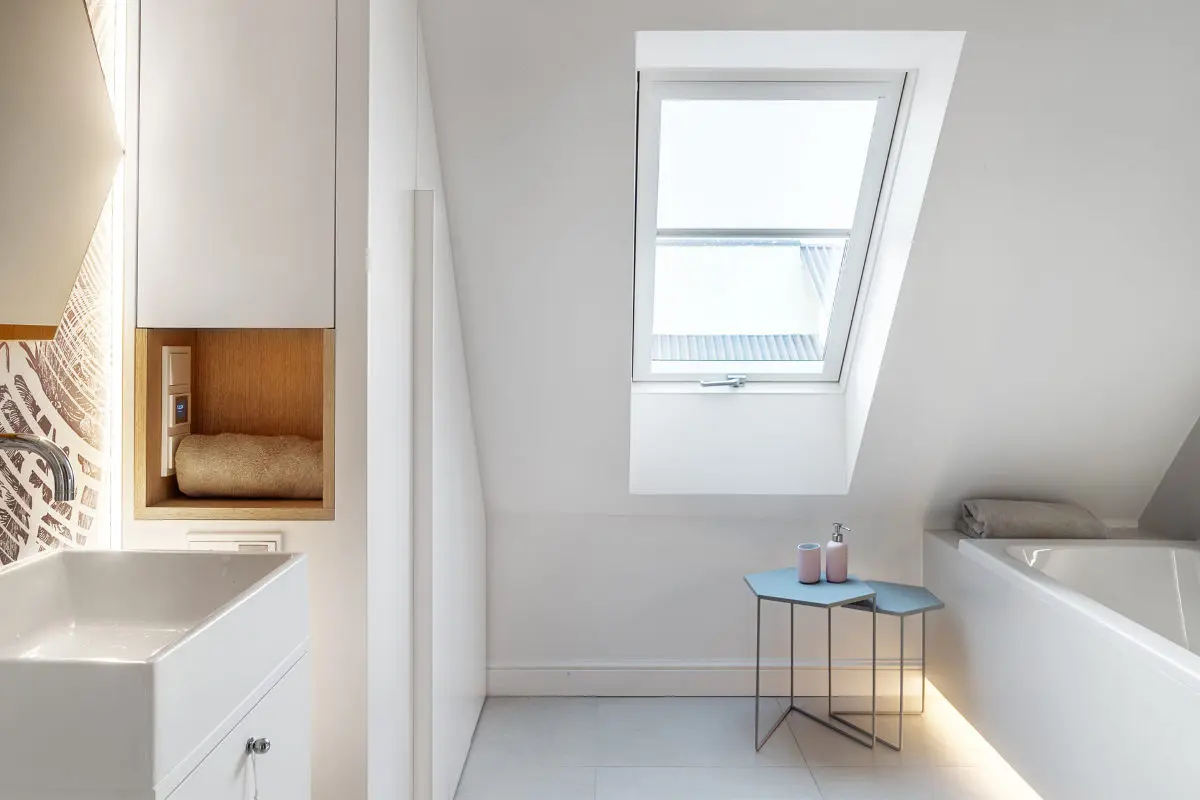Ciekawe rozwiązanie zastosowano także w tej łazience. Tu zamiast wolnostojącej wanny zastosowano tą tradycyjną. Dzięki odpowiedniemu ustawieniu, bez problemu możemy wziąć relaksującą kąpiel. Przy samym skosie znalazły się dwa stoliki pomocniki. Minimalistyczny design łazienki sprawia, że pomimo niewielkiego metrażu wydaje się być przestronna.