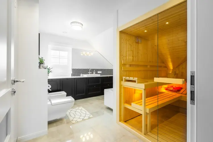 Łazienka na poddaszu z sauną | proj. Coco Pracownia Projektowania Wnętrz
