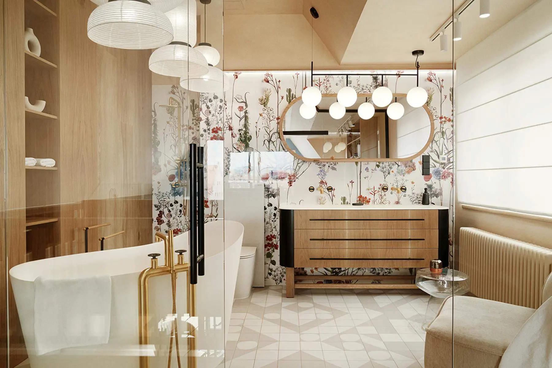 Ważne, aby cała łazienka — mimo podziału na różne strefy funkcjonalne — tworzyła spójną i harmonijną całość. Ciekawym sposobem na uzyskanie takiego efektu w aranżacji łazienki z wanną i prysznicem jest zastosowanie tych samych płytek na ścianach w obrębie strefy kąpielowej. Mogą to być np. płytki z wyrazistym wzorem geometrycznym lub dekoracyjna mozaika. Nic nie stoi również na przeszkodzie, aby w aranżacji wykorzystać tapetę wodoodporną, która doda wnętrzu charakteru i oryginalności.