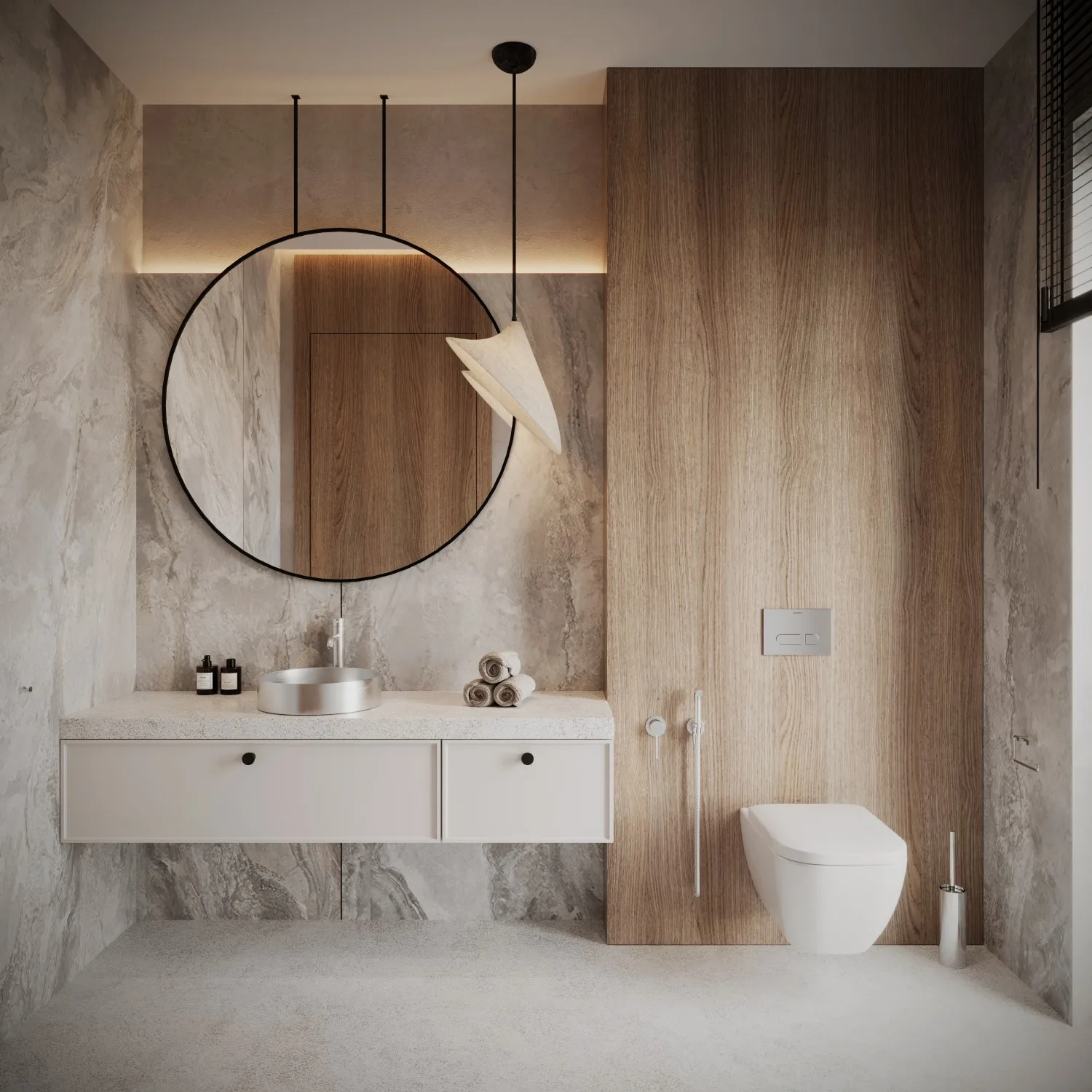 Najogólniejsza zasada mówi o tym, aby zadbać o obecność światła ogólnego, które równomiernie oświetli całe wnętrze (w tej roli sprawdzi się także oświetlenie punktowe, np. oprawy natynkowe, albo wpuszczane) a także to oświetlające strefę umywalkową. W tym przypadku doskonale sprawdzą się kinkiety po obu stronach lustra, albo oprawy wiszące dopełniające aranżację wnętrza.