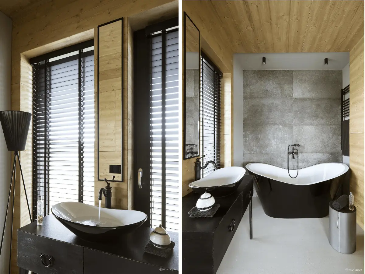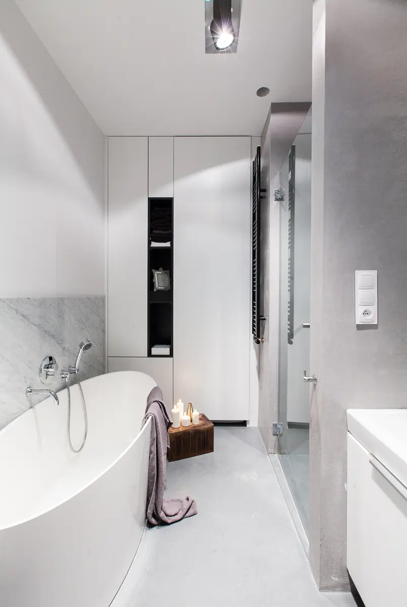 Ale kto powiedział, że wanna wolnostojąca musi stać na środku? Architekci pokazują, że swobodnie możemy ją zainstalować przy jednej ze ścian, do tego bateria podłogowa i jesteśmy urządzeni.