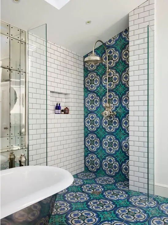 Na podłogę warto położyć patchworkowe (wzorzyste) płytki. Moim zdaniem taka posadzka doskonale sprawdza się w miejscach, które są mocno przez nas eksploatowane. Wyobraźcie sobie, jak po całym dniu może wyglądać łazienka, w której podłoga jest wyłożona białymi wysoko – połyskowymi płytkami, a jak prezentuje się ta z wzorzystą posadzką. Nie dość, że wzorzyste płytki są łatwiejsze w utrzymaniu w czystości, to jeszcze wprowadzają do wnętrza coś nieoczywistego.