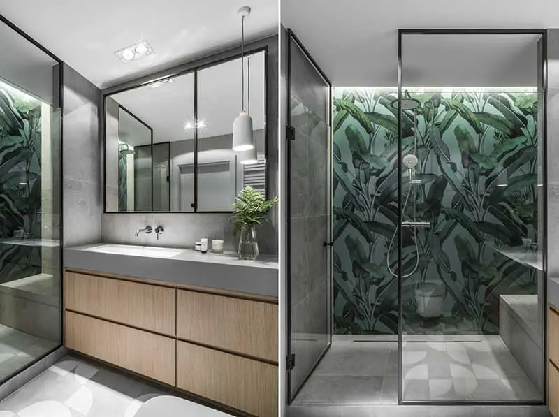 Możemy wybrać liście bananowca, monstery, flamingi, tukany i wiele, wiele innych. Kluczem do aranżacji w tym stylu jest zachowanie odpowiednich proporcji. Nasza łazienka zyska na atrakcyjności, gdy na większości ścian i posadzce znajdą się stonowane szare płytki, natomiast te z motywem tropikalnym tylko w wybranej strefie, na przykład prysznicowej. Inną możliwością jest wybranie dekorów w mocniejszy wzór, które jedynie gdzieniegdzie wpleciemy w aranżację.