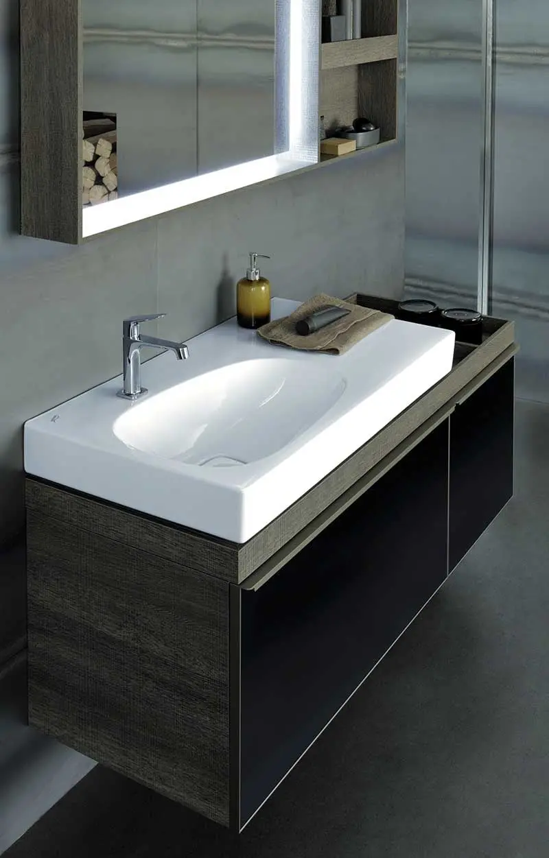 W małym pomieszczeniu sprawdzi się model 40-centymetrowy z półką, na którą można odłożyć kosmetyki, i na której montowana jest bateria – np. model z kolekcji Geberit Xeno² – elegancka, kompaktowa umywalka asymetryczna o rozmiarach 40×28 cm. Tym co wyróżnia produkty z tej gamy, to geometryczna wyrazistość linii na zewnątrz oraz miękkie, naturalnie opływowe kształty w środku.