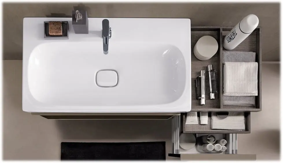 Klasyczna umywalka o rozmiarze ok. 60–70 cm jest uważana za w pełni komfortową. Przykładem może być designerska kolekcja ceramiki Geberit Citterio – efekt współpracy ze znanym włoskim projektantem Antonio Citterio. W serii są dostępne dwa modele umywalek nablatowych: jedne są w formie misy o łagodnej, miękkiej linii, drugie przyciągają uwagę geometrycznym fasonem i szerokimi, wyrazistymi rantami z zewnątrz i owalną linią zagłębienia w środku. Kolekcja włoskiego designera jest przykładem projektu łączącego tak ważne dla użytkowników cechy: funkcjonalność i ponadczasową estetykę. Kształty umywalek nie są podyktowane aktualną modą, lecz wynikają z doświadczenia i autorskiej wizji piękna przedmiotu codziennego użytku. Dlatego przez lata nie stracą nic ze swej unikalności.