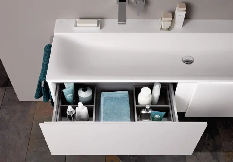 Jeszcze wygodniejszym rozwiązaniem, zwłaszcza dla rodziny z dziećmi, jest montaż dwóch oddzielnych umywalek na wspólnym blacie. Pozwalają one nieco rozładować poranną kolejkę do umywalki, gdy wszyscy się spieszą i liczą każdą cenną minutę. Trzeba przy tym pamiętać, że ta opcja wymaga przynajmniej 140 cm wolnego miejsca (dwie umywalki po 60 cm plus 10 cm między nimi i po 5 cm po lewej i prawej stronie).