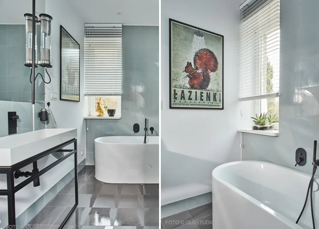 Czarna baterie pasuję nie tylko do wnętrz w industrialnym klimacie, gdzie beton odgrywa główną rolę, ale również stworzymy wyjątkową kompozycję w łazience o nieco pastelowych kolorach. Na drugim zdjęciu mamy przykład przepięknych płytek Mutina z kolekcją Numi w delikatnym kolorze blue w towarzystwie czarnych kranów.