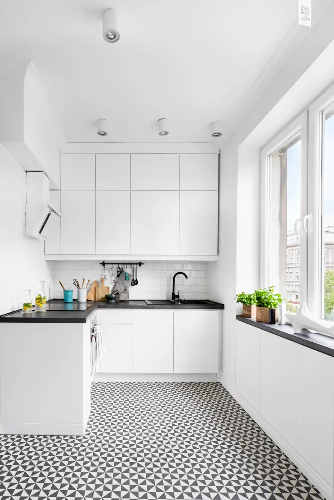Poniżej znajdziecie kolejny projekt białej kuchni, w którym znalazły się tradycyjne kafle. Przypadek? Nie sądzę. Ostatnio architekci bardzo lubią wracać do sprawdzonych rozwiązań. W tym przypadku zastosowano białą fugę, która w ogóle nie wyróżnia się na tle ceramiki w tym samym wybarwieniu. Ciekawą alternatywą dla tego rozwiązania, jest zastosowanie kontrastowej fugi w ciemnym (nawet czarnym czy grafitowym kolorze), której atutem jest łatwe utrzymanie w czystości. Jednak w tym przypadku architekci postanowili, gdzie indziej przenieść mocniejsze akcenty. Czarny blat ze zlewozmywakiem i baterią w tym samym wykończeniu a także podłoga w geometryczny wzór, przełamują dominację bieli.