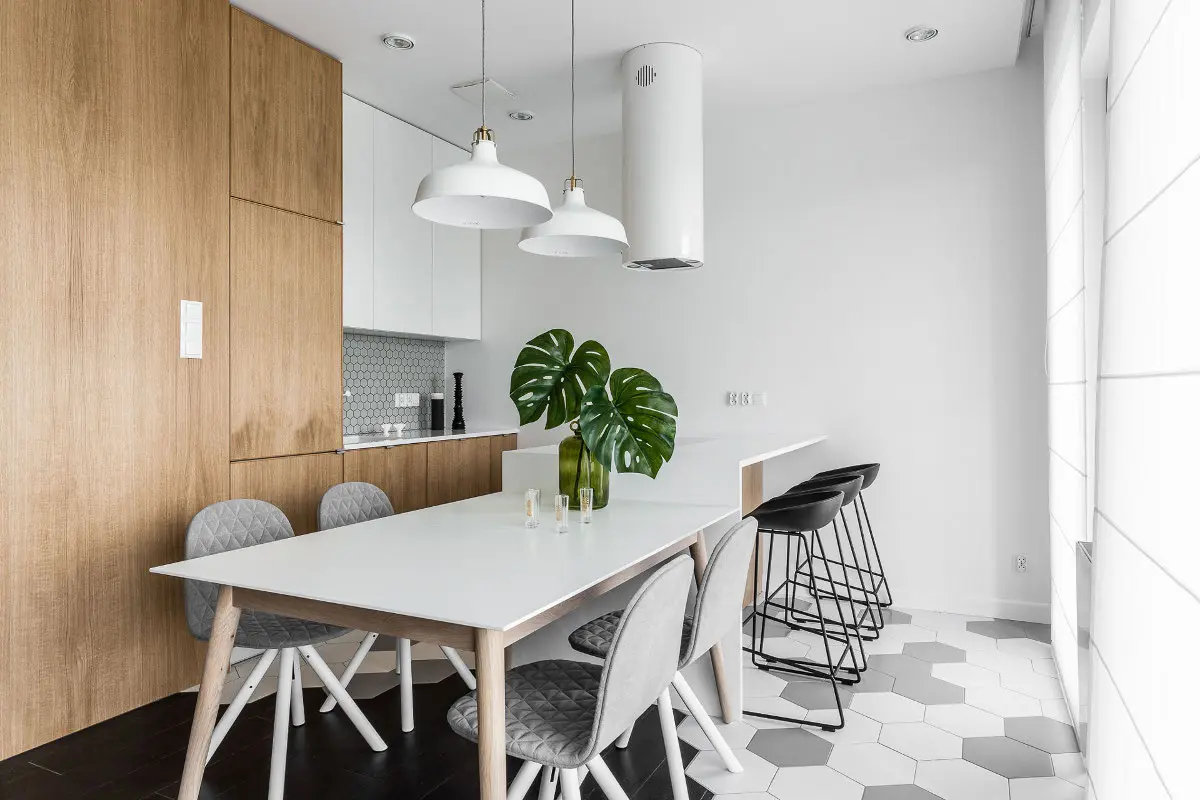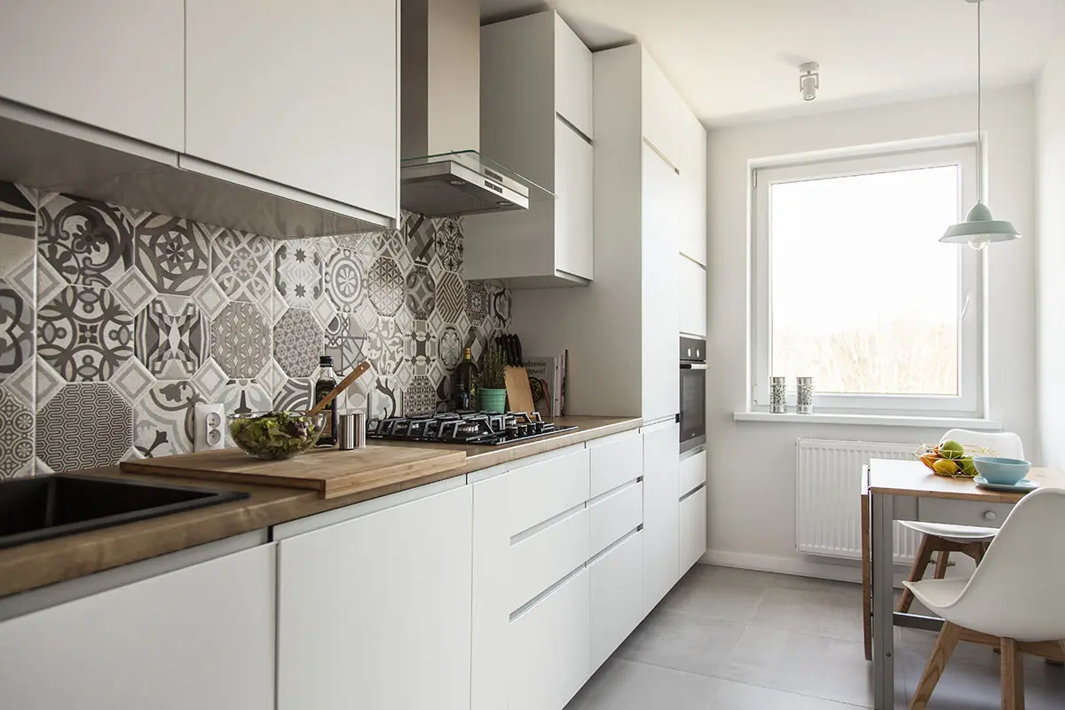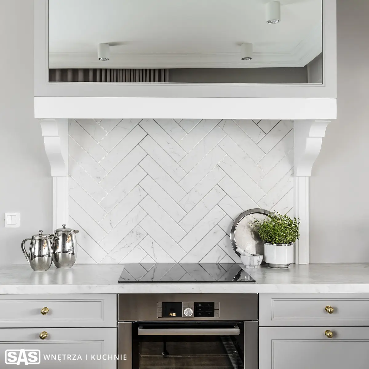 Jeśli zależy Ci na przełamaniu monochromatycznego charakteru kuchni, możesz postawić na kolor kafli w innym kolorze niż tradycyjna biel. Ciekawy akcent może pojawić się również na podłodze, np. w formie ciekawego wzoru czy kształtu płytek. W poniższym projekcie białej kuchni architektki z WZ Studio postawiły na heksagony w trzech kolorach.
