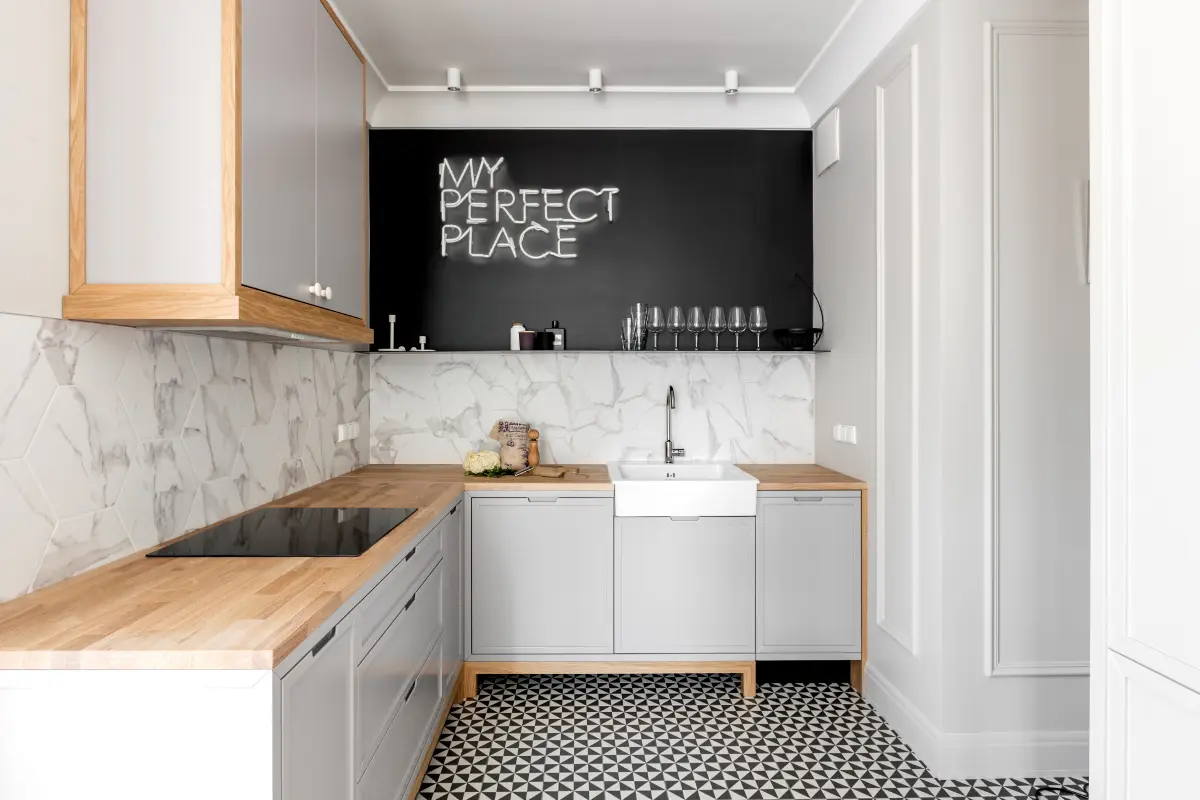Patchworkowa podłoga i marmur na ścianie nad blatem
