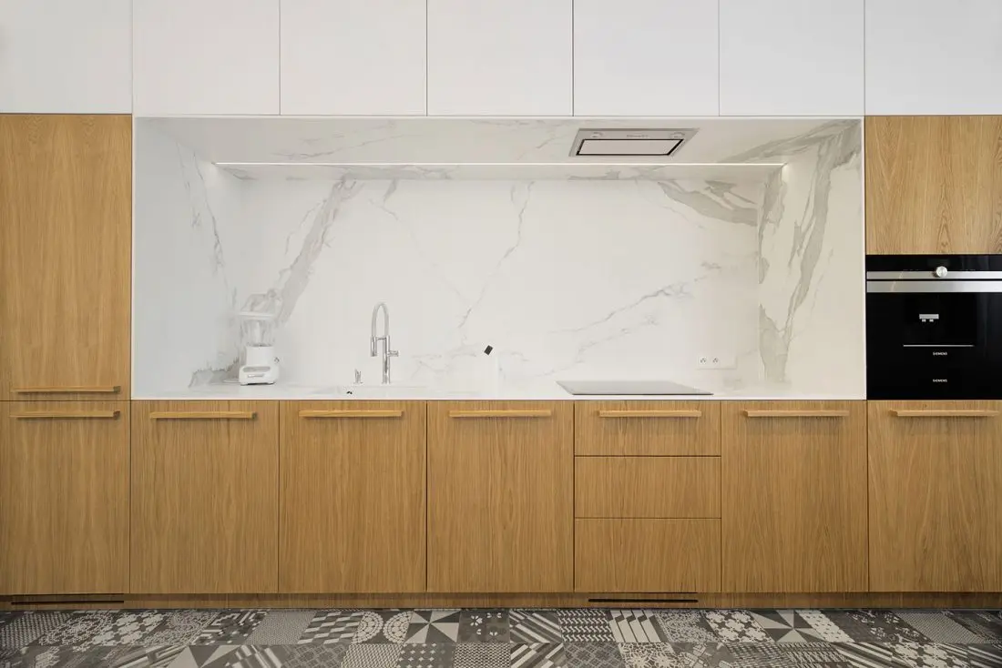 Drewniana kuchnia wcale nie wymaga jedynie klasycznych rozwiązań. Poniższa realizacja jest tego wzorcowym przykładem. Choć nad blatem pojawił się ponadczasowy marmur, to na podłodze zdecydowano się patchworkowe płytki z kolekcji Azulej od Mutiny zaprojektowane przez Patricię Urquiolę. Tak mocny wzór mógłby za mocno zdefiniować wnętrze, dlatego znajdują się tylko na fragmencie podłogi.