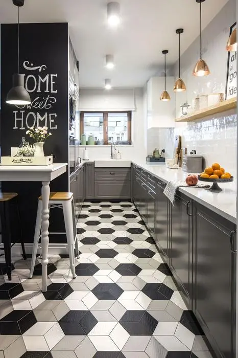 Przed Wami bardzo nowoczesna aranżacja kuchni, którą dodatkowo podkręcają zastosowane płytki. Na ścianie nad blatem znajduje się ceramika w kształcie plastrów miodu z imitacją marmuru, a na posadzce czarno – białe w bardzo geometryczny wzór. To dość mocne połączenie doprawione sztukateriami przełamują nowoczesne meble na nóżkach, które dodają lekkości stylizacji tego wnętrza.