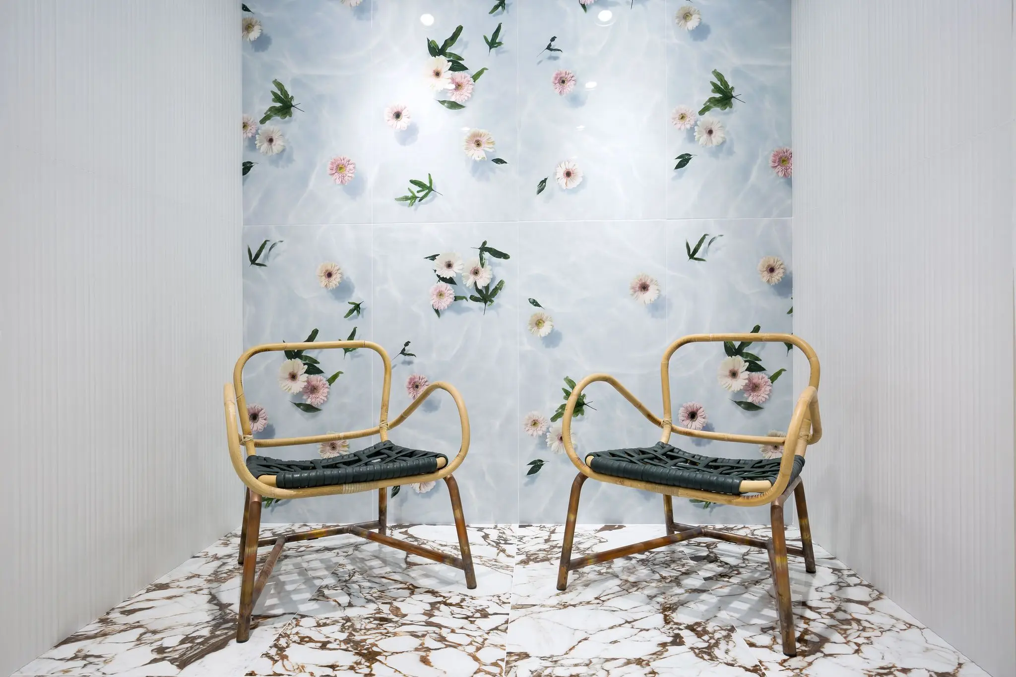 Płytki z motywem kwiatowym są połączeniem dwóch trendów, które królują w aranżacji wnętrz ostatnimi czasy. Oczywiste nawiązanie do natury i lekko romantycznej elegancji – właśnie taki efekt osiągniemy stawiając na florystyczne akcenty we wnętrzu. Dekoracyjne kafelki na ścianie są zazwyczaj łączone w wielkoformatowe obrazy, powstające po połączeniu ze sobą kilku płytek. Konfiguracja – w zależności od modelu kafelek – dowolna.