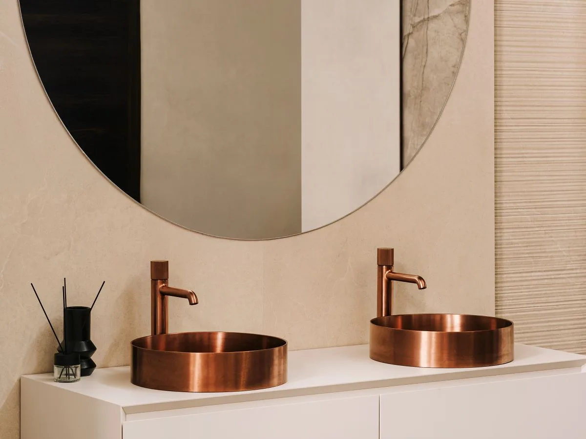 W dużej łazience świetnie sprawdza się długi blat – rozciągający się od ściany do ściany z dwoma umywalkami. Nad nim warto umieścić duże i designerskie lustro lub dwa mniejsze modele. Lustra są bardzo ważne, ponieważ modelują przestrzeń – powiększają ją optycznie i rozjaśniają. Takie efekt jest tak samo ważny w dużym, jak i małym wnętrzu.