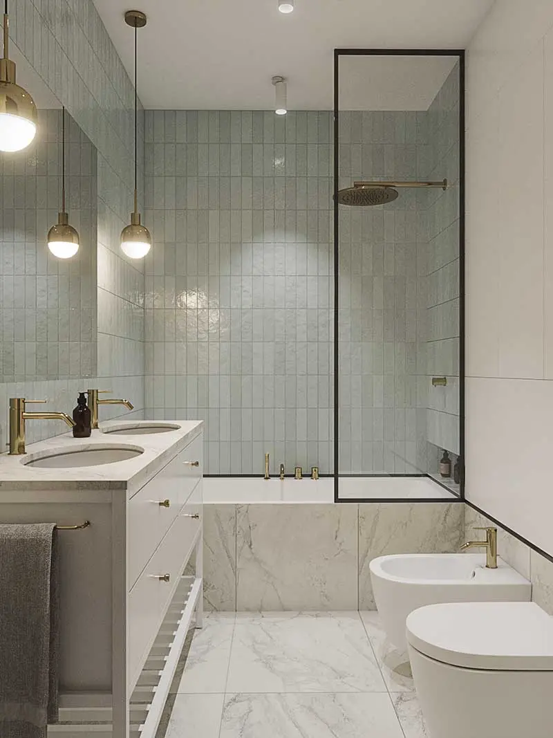 Złoto w naszym zestawieniu pojawia się już po raz któryś… a to oznacza tylko jedno – ten szlachetny materiał jest jednym z najbardziej pożądanych w aranżacji łazienki. Moja ostatnia propozycja to ozdobne listwy w złotym wykończeniu, które stanowią uzupełnienie płytek. Ten prosty zabieg czyni wnętrze oryginalnym, eleganckim i bardzo w trendach!