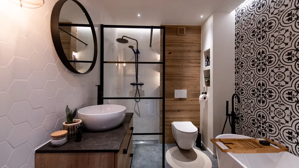 Ogromną popularnością we wnętrzach cieszą się industrialne przeszklenia, czyli te podkreślone czarną metalową ramą. W łazience to rozwiązanie również znajduje zastosowanie, jako oddzielenie strefy prysznicowej od reszty pomieszczenia.