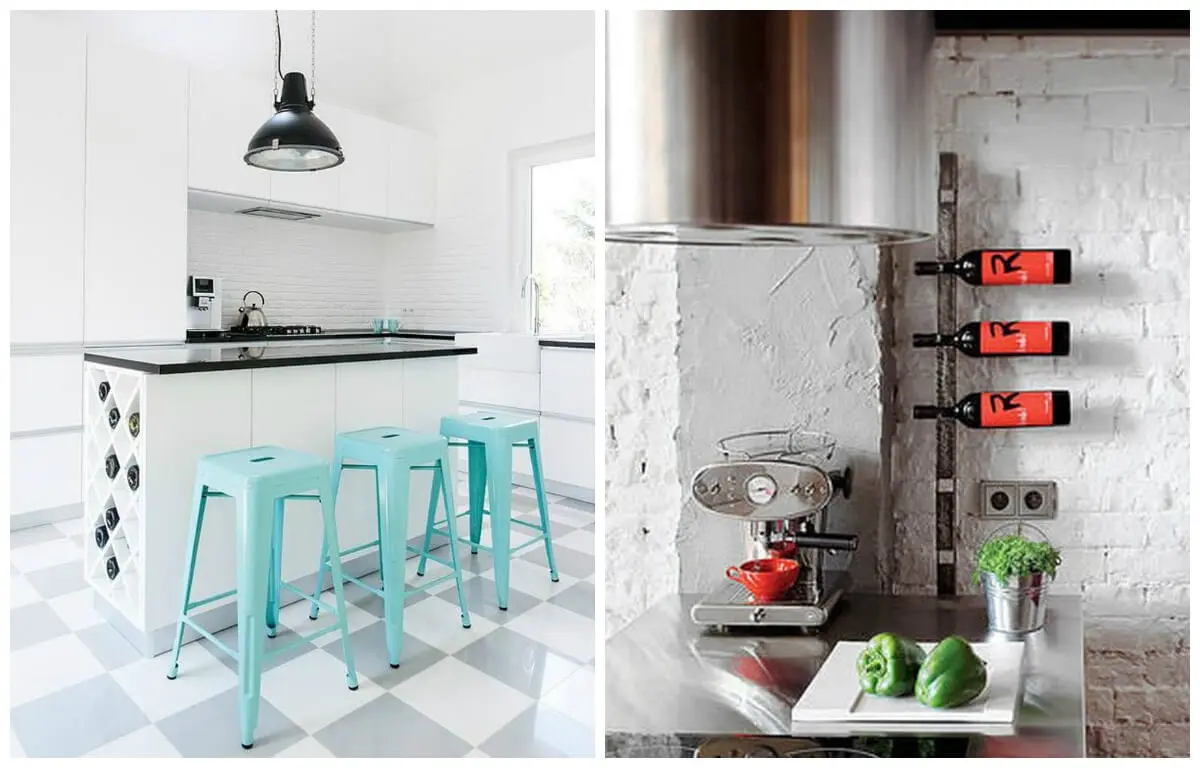 Modne ostatnio stało się pokazywanie szerszej publiczności swoich zbiorów, dlatego też aranżuje się miejsce/stojak na wino, który znajduje się na widocznym miejscu i podkreśla kształt butelek oraz ich kolor. Tak też powstały specjalne stelaże, które przymocowane do ściany chwytają butelkę za szyjkę i tym sposobem tworzą drabinkę butelek jednocześnie przejawiając się jako dodatkowa dekoracja kuchni. Takie kombinacje najlepiej wyglądają w projektach w stylu eklektycznym i loftowymi. W bardziej klasycznych aranżacjach miejsce dla wina może zostać ukryte w kuchennej wyspie lub szafkach (taki sposób przechowywania jest zgodny z regułą zacienionego miejsca).