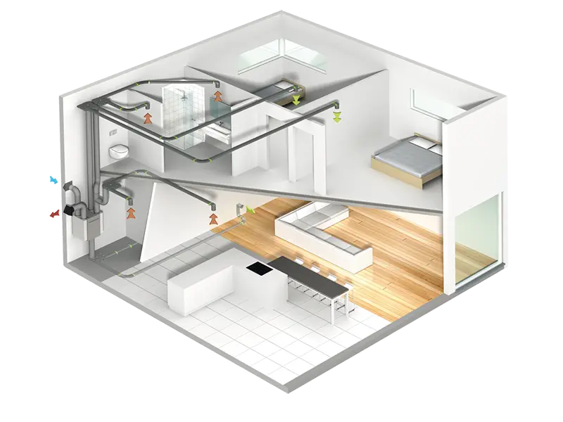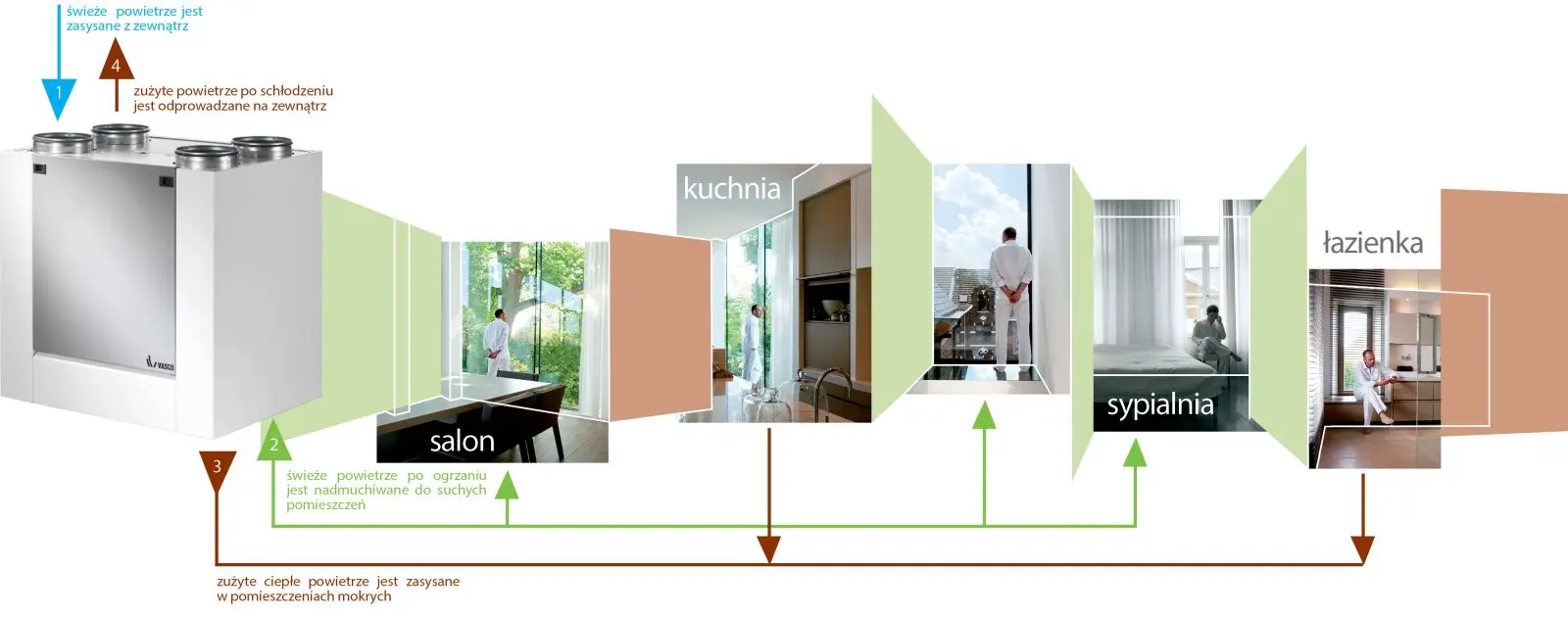 Sercem systemu wentylacji mechanicznej jest rekuperator wyposażony w specjalne filtry. To do niego trafia świeże powietrze zasysane z zewnątrz oraz zużyte powietrze gotowe do odprowadzenia. Zarówno jedno, jak i drugie przechodzi proces filtracji, który eliminuje wszelkie zanieczyszczenia, kurz, roztocza, alergeny, pyły czy cząsteczki smogu. To jedyny system instalacji w budynku, który bez wątpienia wpływa na zdrowie mieszkańców i łagodzi dolegliwości, takie jak alergie, astma, bóle głowy, migreny czy osłabienie organizmu.