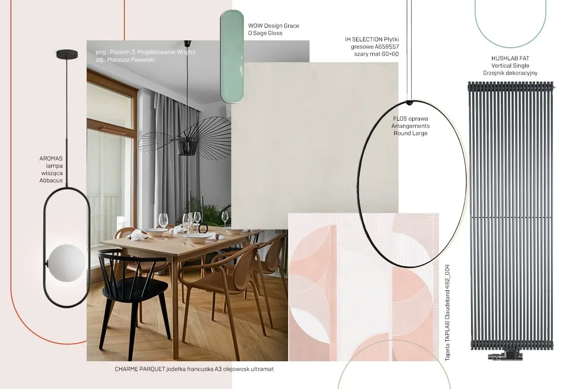 Jak udowadnia projekt pracowni Poziom 3. Projektowanie Wnętrz, elementem który idealnie pasuje do wnętrz w klimacie modern classic jest dębowa jodełka na podłodze. Architektki wybrały kolor A3 z portfolio Charme Parquet – marki dostępnej w naszych showroomach. Idealnym uzupełnieniem jodełki francuskiej są sztukaterie będące kolejnym znakiem charakterystycznym klasycznych aranżacji. Mając taką podstawę wystarczy dodać nowoczesne elementy. Projektantki postawiły na minimalistyczne oprawy oświetleniowe oraz „użyteczne dekoracje”, jak na przykład grzejnik dekoracyjny FAT Vertical Single od HushLab, również z oferty showroomów z Grupy Internity Home. Stonowaną bazę uzupełniają mocniejsze plamy kolorów w formie detali.