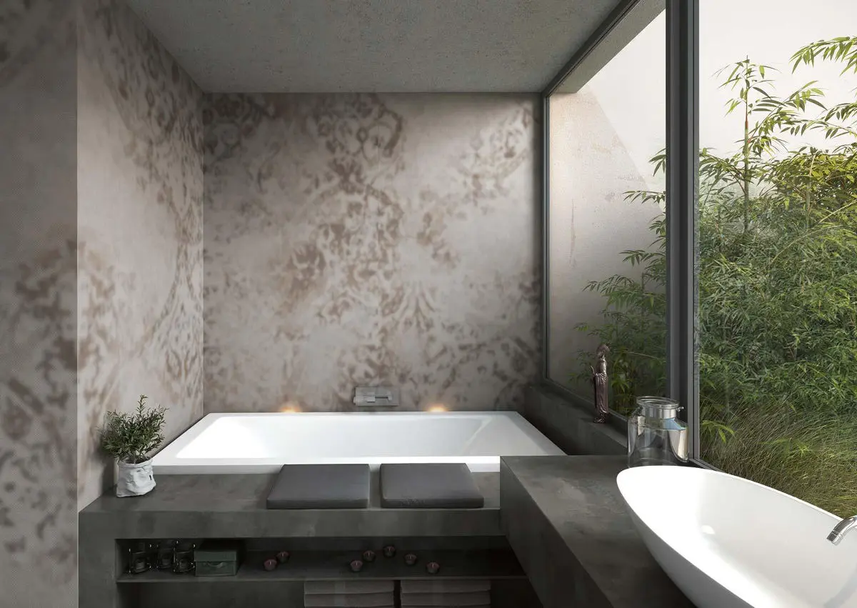 Ta łazienka musiała znaleźć się w moim zestawieniu. Według mnie jest całkowicie doskonała w swej oryginalności. Na ścianach pojawiły się wielkogabarytowe płytki od Marazzi, które swoim wyglądem nawiązują do antycznych dywanów. Dodatkowym smaczkiem jest okno na całą ścianę, przez które do wnętrza wlewa się piękny zielony krajobraz. W takim miejscu kąpiel musi smakować naprawdę dobrze…. Zainspirowani czy rozmarzeni? 😉