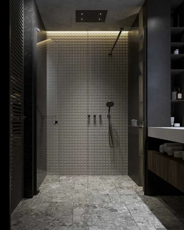 13. Szara łazienka z płytkami trójwymiarowymi marki Marazzi z kolekcji Color Code (pytaj o produkt w naszych showroomach)