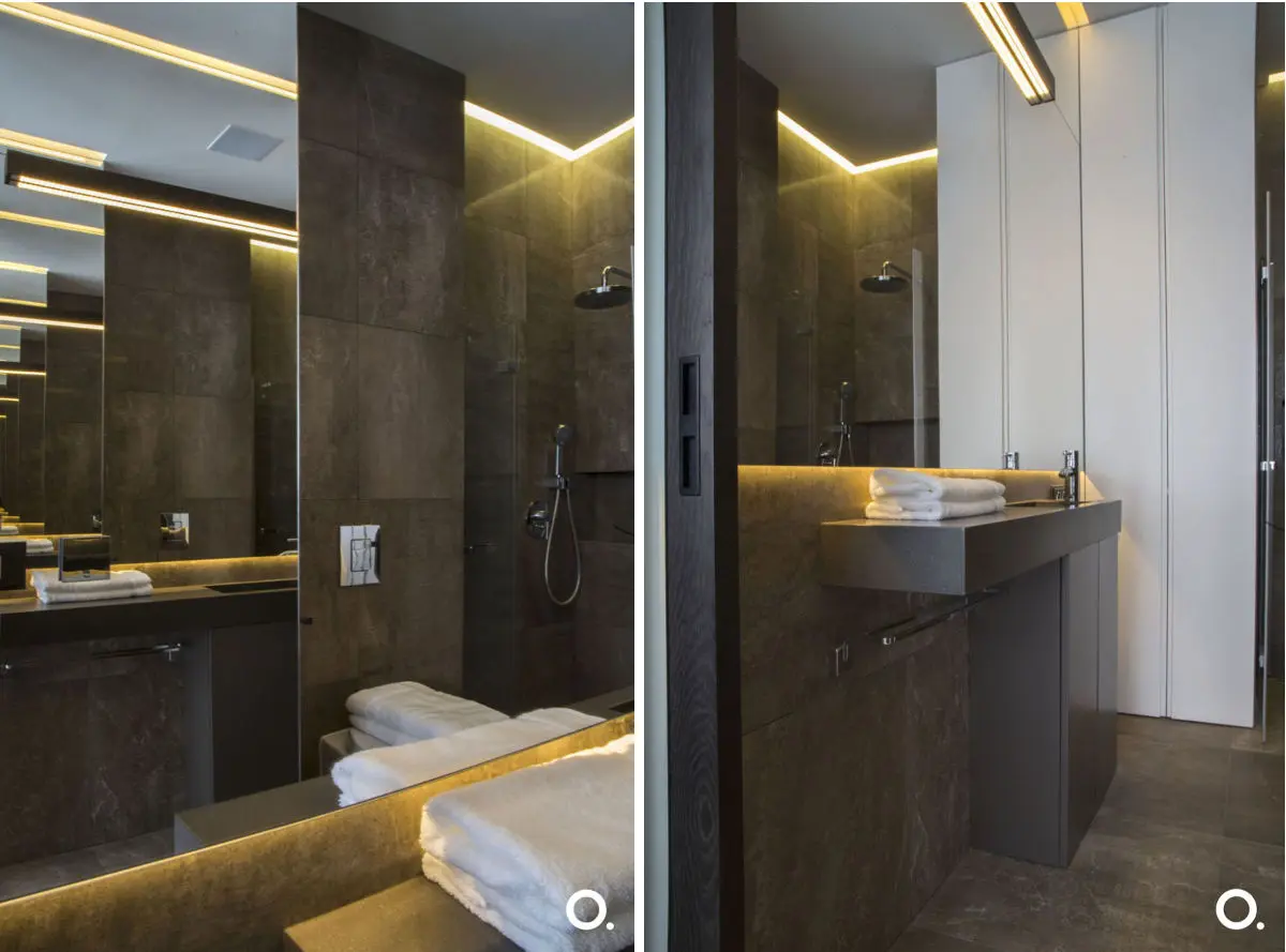 Szare łazienki z betonem w roli głównej najczęściej goszczą w domach w stylu industrialnym i nowoczesnym. Równie często sprawiają wrażenie chłodnych, surowych… Jeśli komuś zależy na takim efekcie, to nie widzę nic przeciwko. Jednakże moim zdaniem, warto dodać im odrobinę przytulności. Architekci z pracowni Studio.O. również postanowili pójść tym tropem, ale nie drogą na skróty (najczęściej w tym celu wprowadza się do wnętrza drewno lub materiał imitujący go). Stylowe podświetlenia z ciepłym światłem nie tylko dodają łazience przytulności, ale też tworzą nastrojowy klimat.