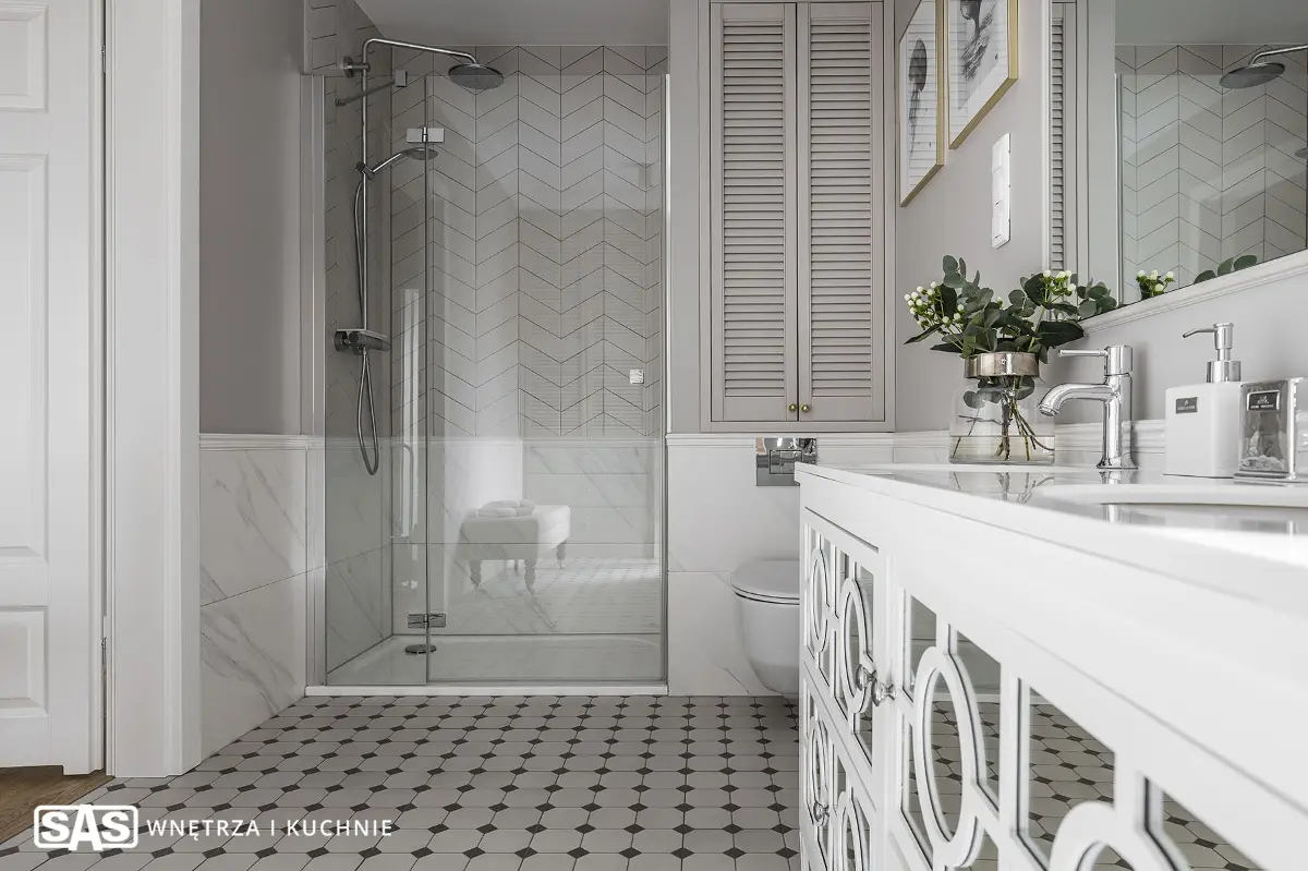 Łazienka w popielatych kolorach z akcentem marmuru i wzorzystą podłogą | proj. JT Grupa