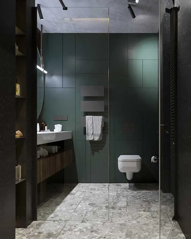 Teraz coś dla prawdziwych fanów rozwiązań niesztampowych. W rzeczy samej, tę łazienkę śmiało można zaliczyć do szarych, ale na pewno nie pospolitych. Wszystko za sprawą butelkowej zieleni. Wprowadzona na jedną ze ścian, tak mocno definiuje tę przestrzeń, że nie sposób oderwać od niej wzroku. Na posadzce znalazły się tak zwane ,,salcesony”. Potoczna nazwa lastryko może i nie brzmi zachęcająco (przynajmniej dla mnie), ale w takim wydaniu powracające na salony lastryko, może być ochrzczone nawet salcesonami. Tak wykończona podłoga wyśmienicie uzupełnia cały projekt, a patrząc na nią od strony praktycznej – mam wrażenie, że to rozwiązanie najlepsze z najlepszych. Na niejednolitej nawierzchni na pewno mniej widać różnego rodzaju zabrudzenia czy zarysowania. Nic, tylko brać!