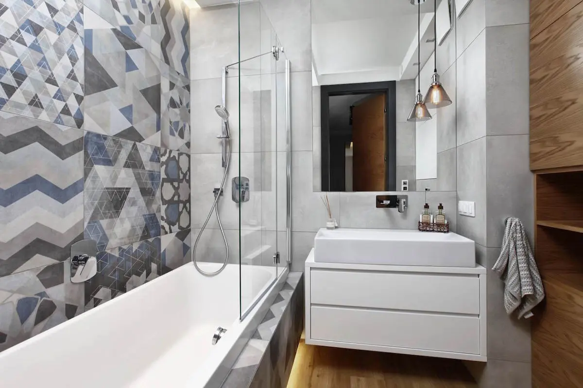 Szara łazienka w puzzle (w projekcie są widoczne płytki od Mutiny, które możesz kupić w naszych salonach stacjonarnych)