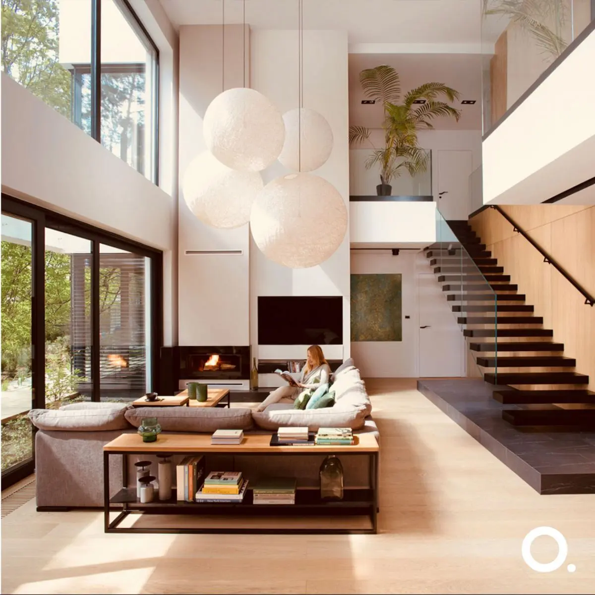 - wnętrza z dużymi oknami, które są źródłem naturalnego światła oraz pozwalają na przenikanie wnętrza z otoczeniem zewnętrznym (najlepiej z ogrodem);